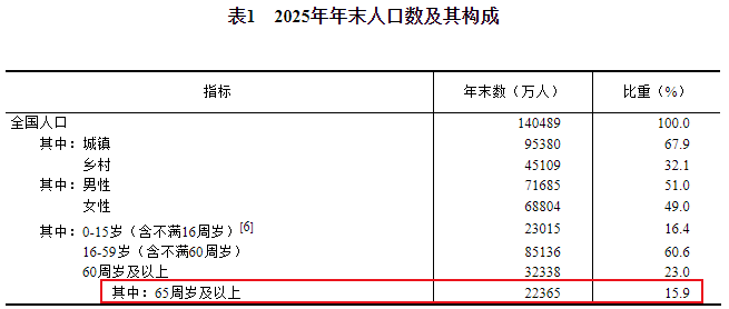 国家统计局数据显示,2025年我国65岁以上老人规模22365万人,占比15.9%。
