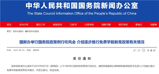据国新网发布万银鼎信,国务院新闻办公室将于2025年8月7日(星期四)上午10时举行国务院政策例行吹风会,请财政部副部长郭婷婷和教育部有关负责人介绍逐步推行免费学前教育政策有关情况,并答记者问。