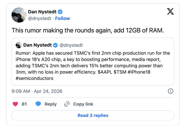 【CNMO科技新闻】根据知名行业分析师Dan Nystedt在社交平台发布的情报,苹果计划在标准版iPhone 18上配备高达12GB的运行内存。这一举措将使基础款机型的内存容量直接对标去年秋季发布的iPhone 17 Pro系列,标志着苹果入门级旗舰手机在内存规格上将迎来突破。
