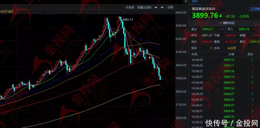 隔夜仁信,现货黄金收盘暴跌131.28美元,跌幅3.19%,最终收报于3981.37美元,金价盘中曾跌至3970.81美元,是10月10日以来最低。今日欧市盘中,黄金延续跌势,目前在3887美元附近徘徊。